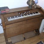 Een klein Frans drukwindharmonium van een onbekende maker. Op een rommelmarkt gekocht, een compleet wrak, maar met liefde en geduld in speelbare staat gebracht.