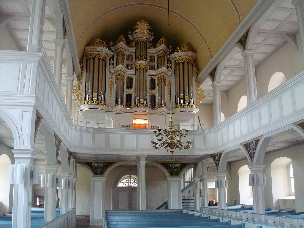 Gebouwd van 1735 tot 1740 door Johann Mathias Hagelstein. De frontpijpen zijn in 1917 gevorderd, waarna er zinken exemplaren zijn geplaatst. Paul Ott reviseerde het instrument in 1954/1955. Om het pedaal helderder van klank te maken plaatste hij op een extra lade drie nieuwe pedaalregisters: een Nachthorn 1′, Mixtur 5 fach en Cornett 2′. In 1991 is het orgel geheel gerestaureerd door de firma Hillebrand. De frontpijpen zijn opnieuw gemaakt van tin. De toevoegingen van 1955 zijn weer verwijderd. Het mechanische sleepladen-orgel heeft een Neidhardt-stemming. De toonhoogte is 5/8 boven normaal en de winddruk is 68 mm waterkolom.