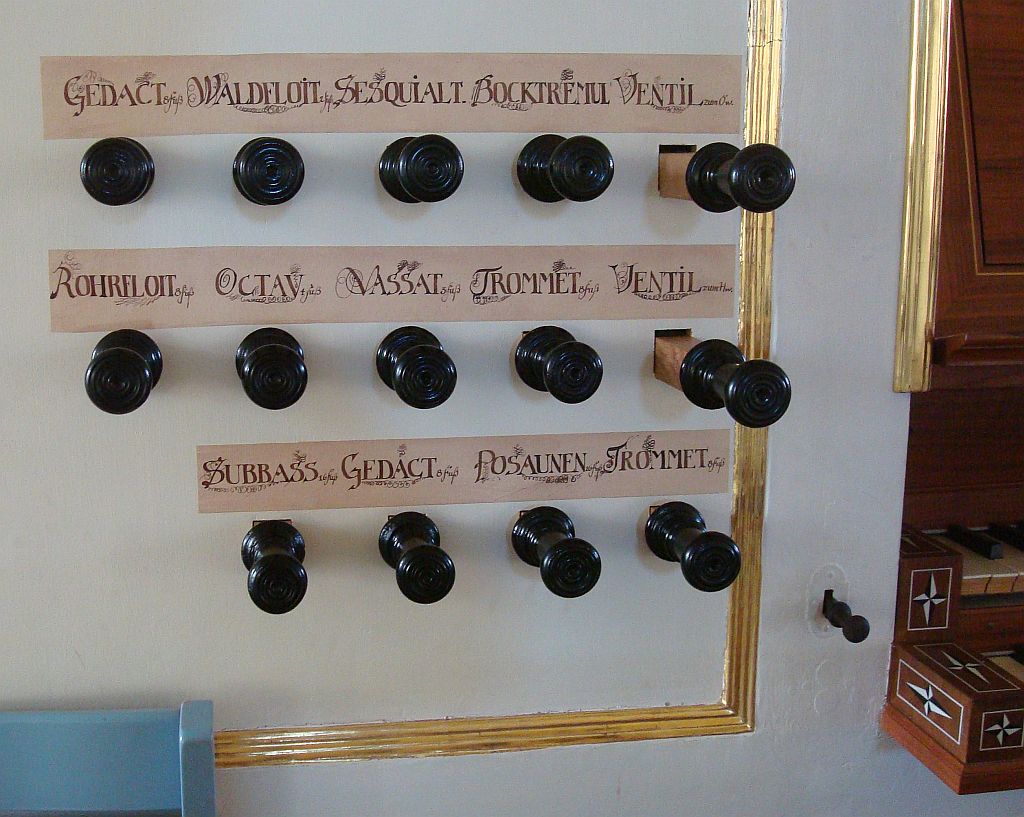 | Spitzfloit | 4′ | Waldfloit | 2′ | Octav | 4′ | Ventil Oberwerk | |