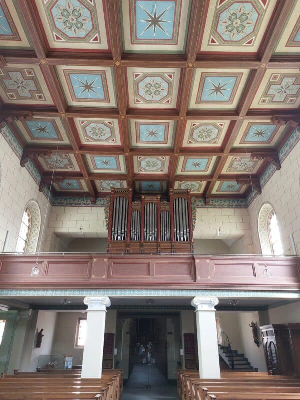 II. MANUAL (C-g3): 56 TOETSEN Gedackt 8′, Spitzflöte 4′, Prinzipal 2′, Quinte 1 1/3′, Rauschterz 3 fach (1/2′), Rohrschalmey 8′, Tremulant.