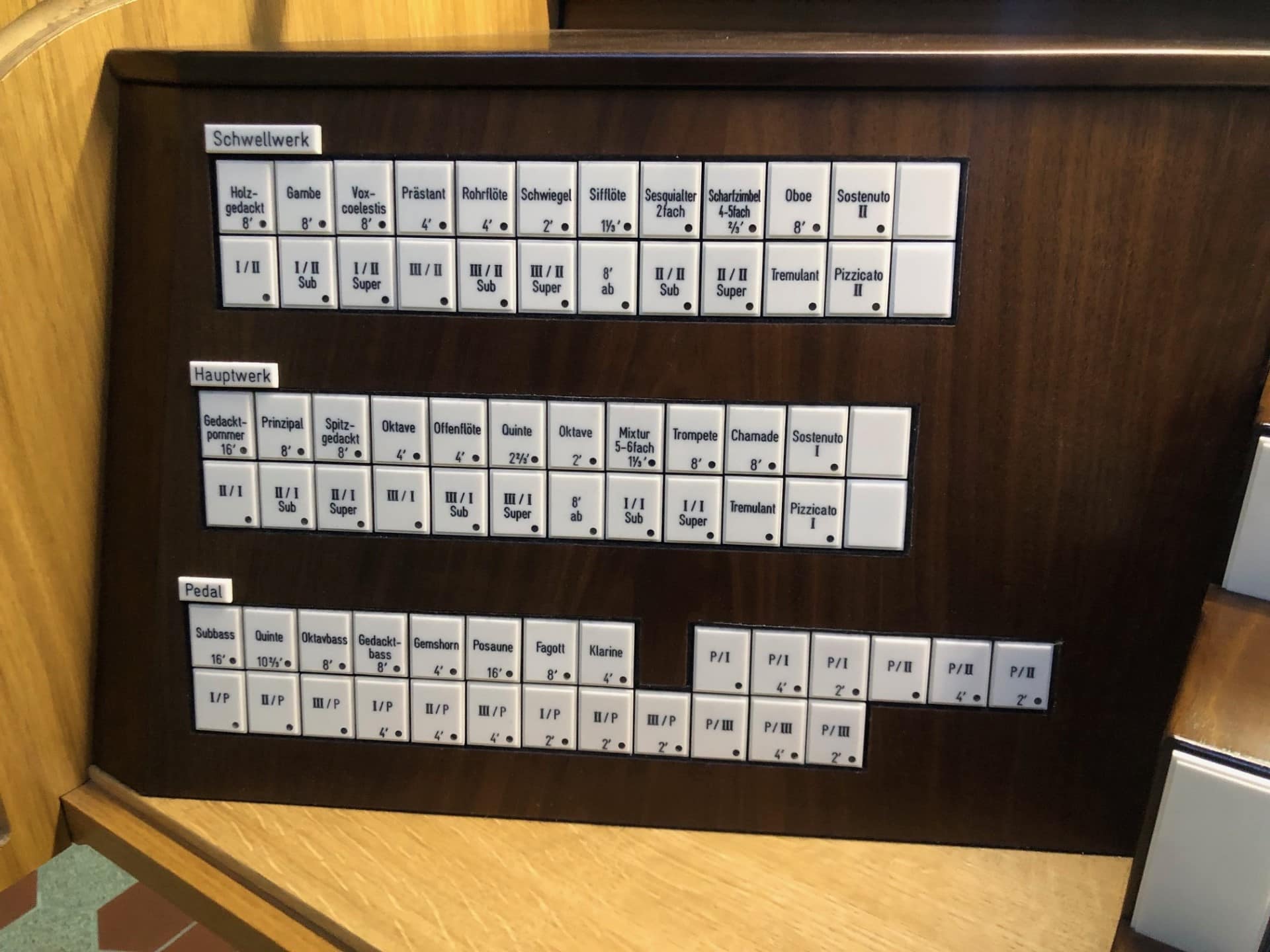 Koppelingen: Hauptwerk – Schwellwerk, Pedal – Hauptwerk, Pedal – Schwellwerk.