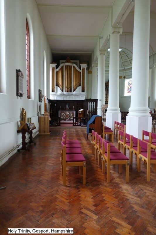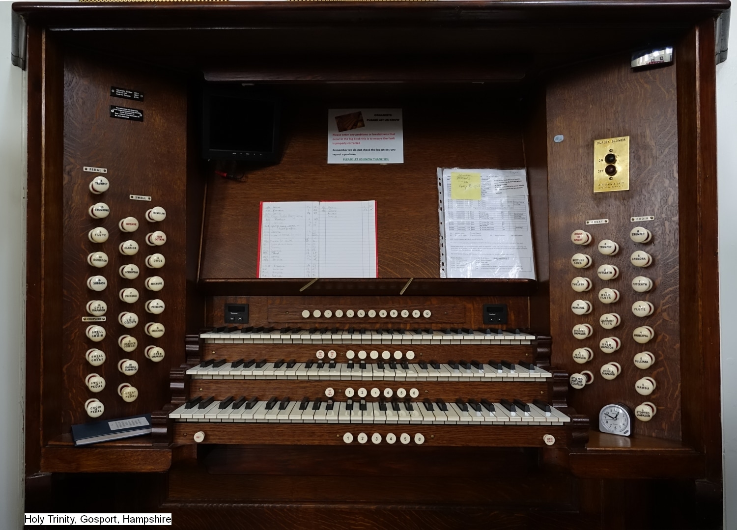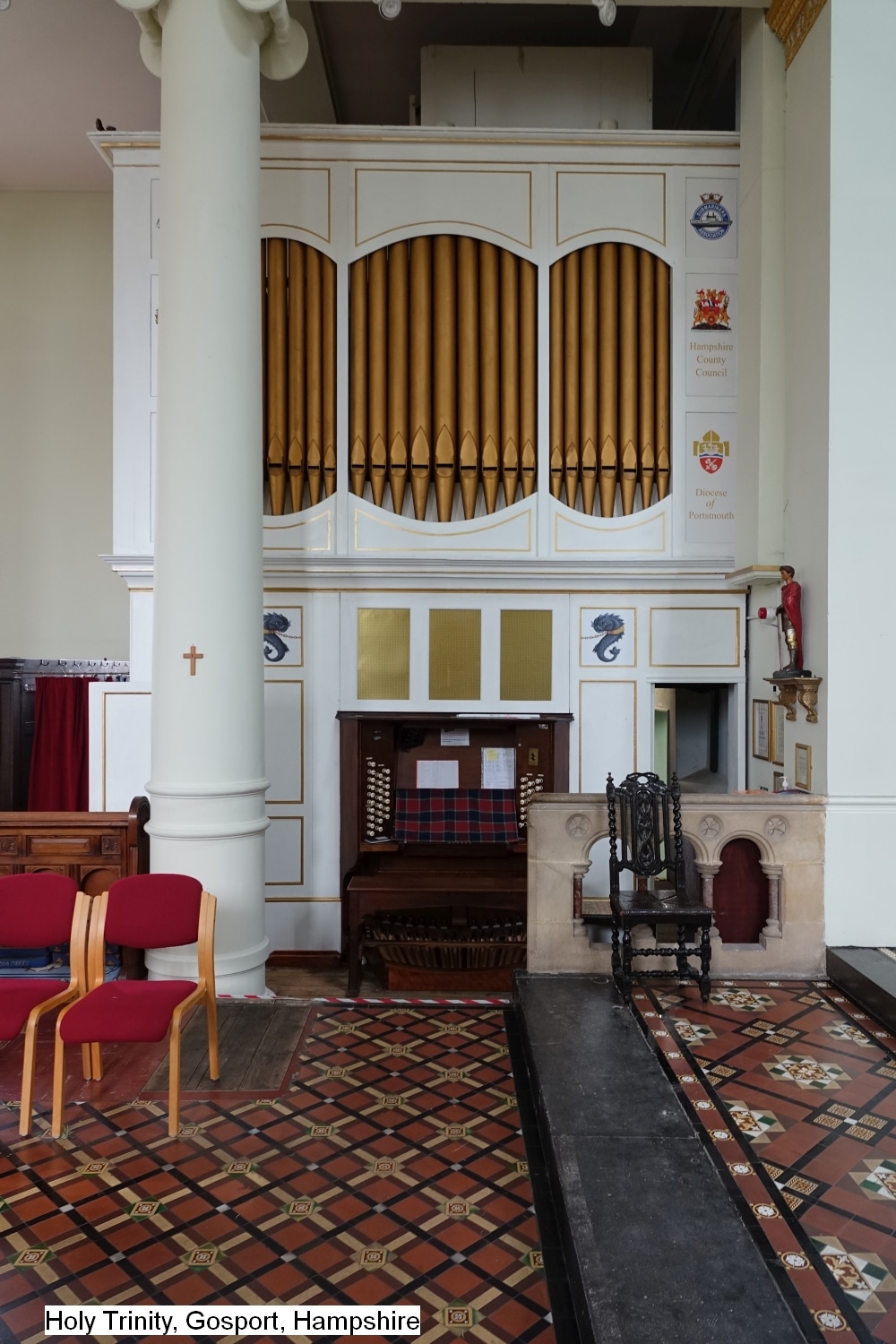 Abraham Jordan bouwde in 1720 een nieuw huisorgel met mechanische tractuur en sleepladen voor het huis van de Duke of Chandos in London (Canons Park) UK. Later in een onbekend jaar is het door Jones overgeplaatst naar de Holy Trinity Church in Gosport (Hampshire) UK. Parker repareerde het instrument omstreeks 1840. Alfred Hunter voerde omstreeks 1865 werkzaamheden uit. In 1874 en 1897 werkte William Hill & Sons aan het orgel. Het orgel is later pneumatisch gemaakt. In 1972 plaatste Hill, Norman & Beard een aantal nieuwe koppels erbij en een tremulant. In 2012 maakte Andrew Cooper & Co. de tractuur elektro-pneumatisch en breidde hij het orgel uit naar 36 (34) stemmen, 3 manualen en een vrij pedaal. Het pedaalklavier is radiaal concaaf.
