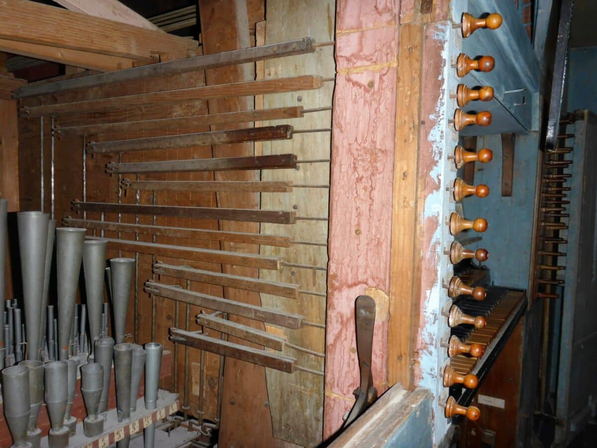 De lade en pijpwerk van het positivo staan links van de claviatuur in de onderkas. Zie prent (van voor de laatste restauratie).