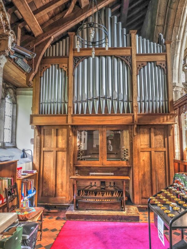 Great: C – c4 Open Diapason 8′, Clarabella 8′, Principal 4′, Flute 4′, Twelfth 2 2/3′, Fifteenth 2′.