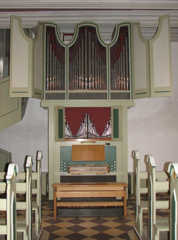 BRYSTVÆRK (C – g3) 56 TOETSEN: Gedakt 8′, Blokfløjte 4′, Principal 2′, Kvint 1 1/3′, Regal 8′.