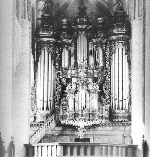 Pedal: Principal 32′, Principal 16′, Sub-Bass 16′, Octava 8′, Gedact 8′, Octava 4′, Nachthorn 4′, Rauschpfeiffe 2 fach, Mixtura 5 fach, Cimbel 3 fach, Gross-Posaun 32′, Posaune 16′, Dulcian 16′, Trommete 8′, Krumhorn 8′, Schallmey 4′, Cornet-Bass 2′.