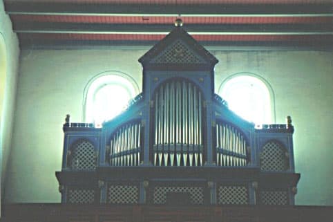 | II Hauptwerk (C-g3) Bordun 16′ * Prinzipal 8′ Rohrflöte 8′ * Gambe 8′ * Oktave 4′ Spitzflöte 4′ Rauschpfeife 2f. 2 2/3′ Waldflöte 2′ Mixtur 5f. 1 1/3′ Trompete 8′ * Tremulant |