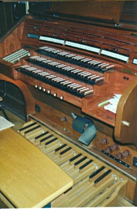 III Schwellwerk (C-g3) Gedackt 16′ Geigenprinzipal 8′ * Liebl. Gedackt 8′ * Salicional 8′ * Vox coelestis 8′ Prinzipal 4′ Gedackt 4′ * Nasat 2 2/3′ Oktave 2′ Terzflöte 1 3/5′ Sifflet 1′ Scharff 4f. 1′ Basson 16′ Oboe 8′ * Clarine 4′ Tremulant |