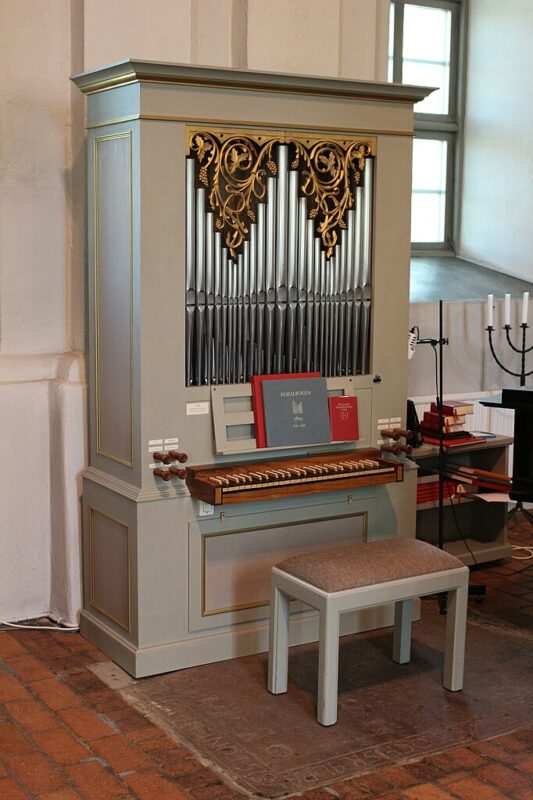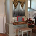 Manual (C-f3, deling tussen c’/cis’) 54 toetsen: Trägedackt 8′ (B/D), Hålflöjt 4′ (B/D), Principal 2′ (B/D), Nasat 1 1/3′ (B/D).