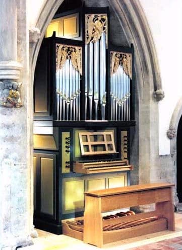 The design of the organ is very compact: all the manual pipes are arranged on a common soundboard with the eight foot stops sharing a common bass, and the Subbass pipes stand on a separate chest behind the main case. Open metal pipes are cut to length and cone tuned, while the flutes have soldered tops and flexible ears for tuning.