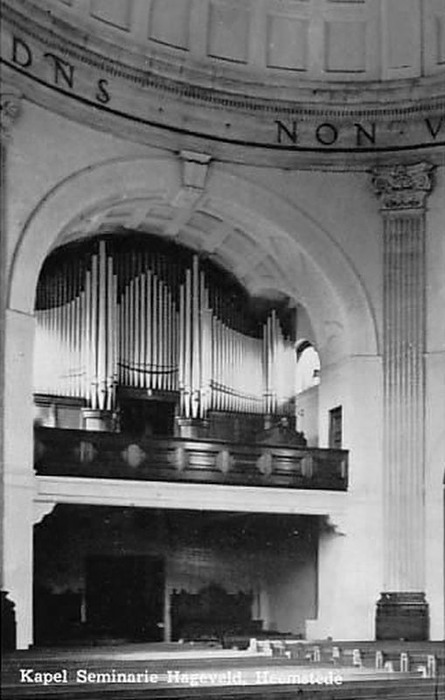 Het binnenwerk van dit orgel is oorspronkelijk in 1877 gemaakt door Petrus Adema voor de kapel van het seminarie Hageveld te Voorhout. In 1933 werd dit orgel overgeplaatst naar Heemstede, in de kapel van het inmiddels naar deze plaats verhuisde seminarie Hageveld. Het kreeg daarbij een nieuwe tractuur d.w.z. pneumatisch kegelladensysteem. In 1938 kreeg het orgel een (nieuw) front dat geplaatst werd door Hubert Schreurs, de neef van Joseph Adema. Tevens werd de dispositie gewijzigd. In 1966 is de dispositie opnieuw door Schreurs veranderd.