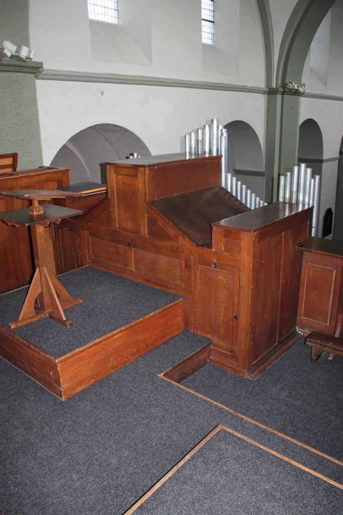 Rugpositief: C – g3 Nachthoorn 8′, Kwintadeen 8′, Prestant 4′, Roerfluit 4′, Octaaf 2′, Scherp III-IV sterk (1 1/3′), Kromhoorn 8′.