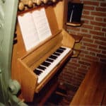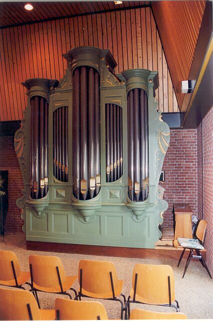 6000 gulden hun Proper-orgel uit omstreeks 1895. Dit was oorspronkelijk gebouwd voor de kerk van Krabbendijke in Zeeland. Ik demonteerde het met hulp van gemeenteleden en collega’s en we sloegen de delen zolang op. Toen de kerk bijna klaar was plaatste ik (met de alreeds genoemde hulp) de kas(t) in de kerk. Dan was die plek alvast bezet en kon de gemeente zo wennen aan het voor de kleine kerk eigenlijk iets te grote front. Dit geschiedde rond september 1980. Daarna besteedde ik een jaar aan het restaureren van het binnenwerk en kwam het gereed in oktober 1981. De intonatie werd verricht door de heer Hoogendoorn van de firma BAG. Hij verving tevens een aantal pijpen van de mixtuur die door veelvuldig stemmen te erg waren beschadigd. Het orgel werd in gebruik genomen in een dienst, waarin de dia’s van het restauratieverloop werden getoond, gevolgd door een orgelbespeling door Harmke Kroeze, de dochter van mijn goede orgelvriend Fré Kroeze uit Almen.