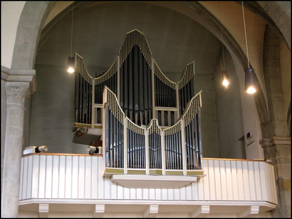 Rückpositiv: Gedackt 8′, Prinzipal 4′, Rohrflöte 4′, Nachthorn 2′, Quinte 1 1/3′, Sesquialter 2 fach (2 2/3′), Scharff 3 fach, Schalmey 8′, Tremulant.