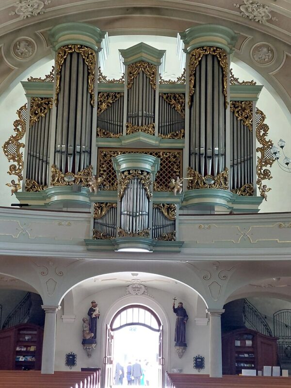 SCHWELLWERK (C-g3): 56 TOETSEN Gedackt 8′, Salicional 8′, Principal 4′, Blockflöte 4′, Nasat 2 2/3′, Waldflöte 2′, Terz 1 3/5′, Scharff 4-5 fach (1 1/3′), Dulcian 16′, Schalmeyoboe 8′, Tremulant.