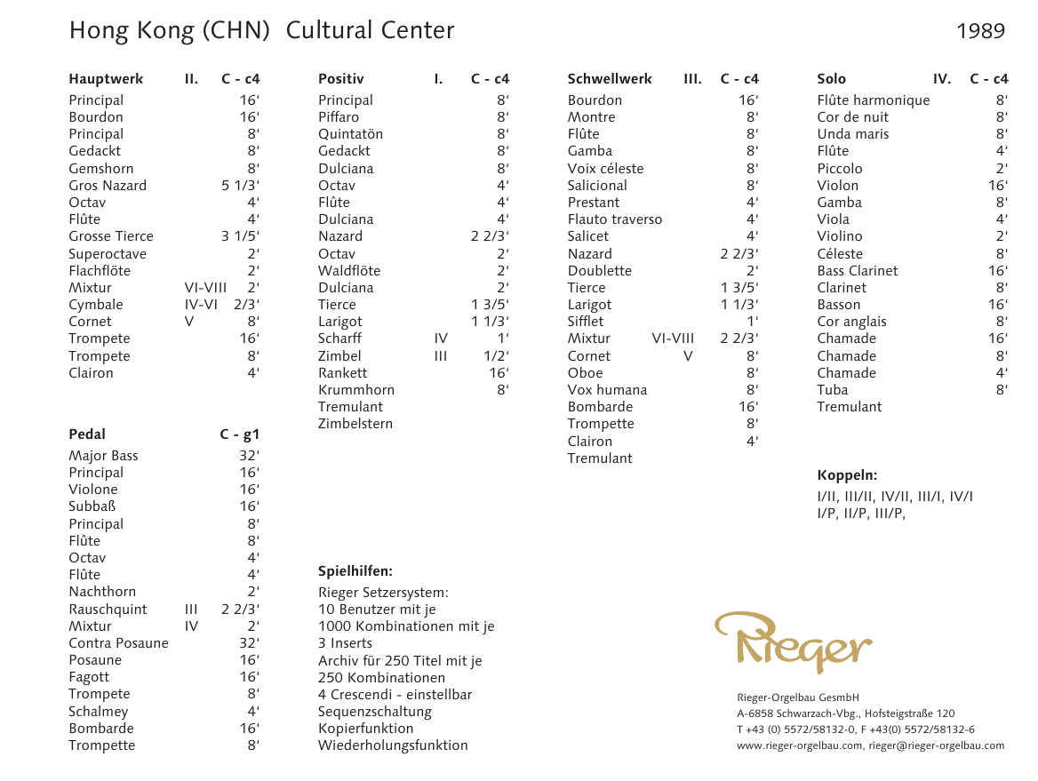In 1989 bouwde Rieger Orgelbau een nieuw orgel met 4 manualen en een vrij pedaal voor het Hong Kong Cultural Centre in Hong Kong (Hong Kong) China.
