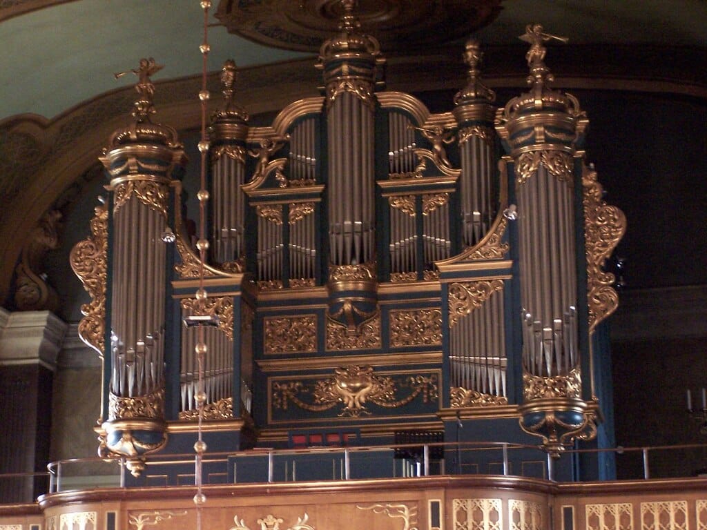 Huvudverk (C-c4): 61 toetsen Principal 16′, Principal 8′, Flute Traversiere 8′, Gambe 8′, Bourdon 8′, Octave 4′, Flute Conique 4′, Octave 2′, Grand Cornet 5 kor, Fourniture 5 kor, Trompette 8′, Clairon 4′.