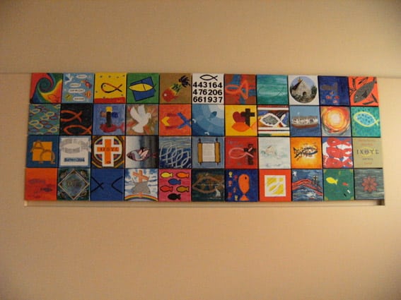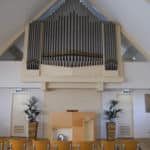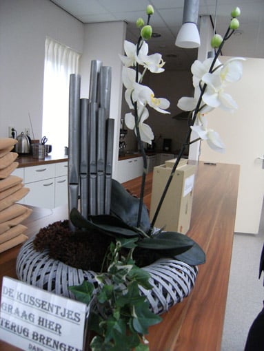 Een deel van het oude pijpwerk van de Mixtuur is gebruikt voor een bloemstukje in de hal van de kerk.