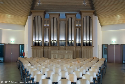 Bij de bouw werd zowel voor de klank als de vormgeving aansluiting gezocht bij de orgelbouw van de tweede helft van de 19e eeuw. Het orgel staat opgesteld op de vloer aan de achterzijde van de kerkzaal waarin de circa 1.000 zitplaatsen in een halve cirkel om het liturgisch centrum zijn geplaatst. In 1993 was bij de kerkbouw al rekening gehouden met de plaatsing van een orgel. Achter de orgelwand was ruimte gereserveerd voor windvoorziening. Voor de bouw van dit orgel is de wand opengebroken om tevens plaats te bieden aan het zwelwerk. Het hoofdwerk is voor het zwelwerk geplaatst, in het midden van de orgelkast. Het pedaal staat opgesteld aan weerszijden van het hoofdwerk. Het geheel mechanische