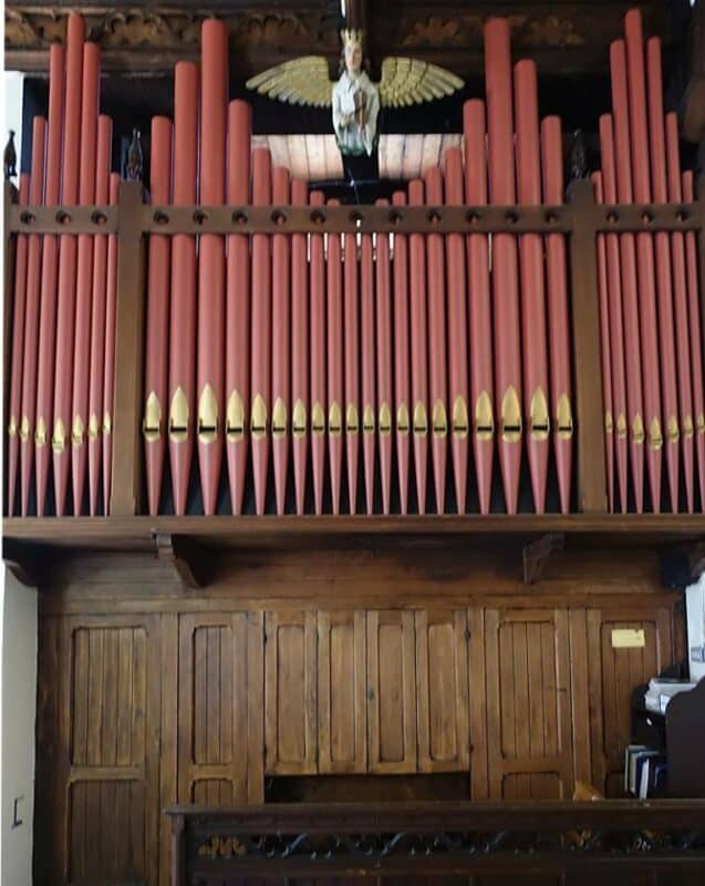 GREAT (C – g3) 56 TOETSEN: Open Diapason 8′, Rohr Flöte 8′, Gamba 8′, Principal 4′, Harmonic Flute 4′, Fifteenth 2′, Mixture II, Trumpet 8′.