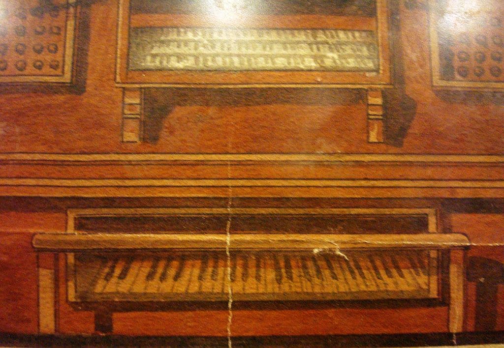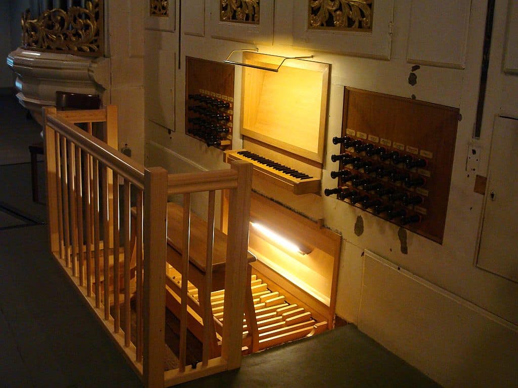 3.Manual Dulcian 16′ Quintadena 8′ Prinzipal 4′ Gedackt 4′ Oktave 2′ Kleine Flöte 2′ Larigot 1 1/3 ‘ + 1′ Mixtur 4fach Sesquialtera 2fach Fagott 8’ |