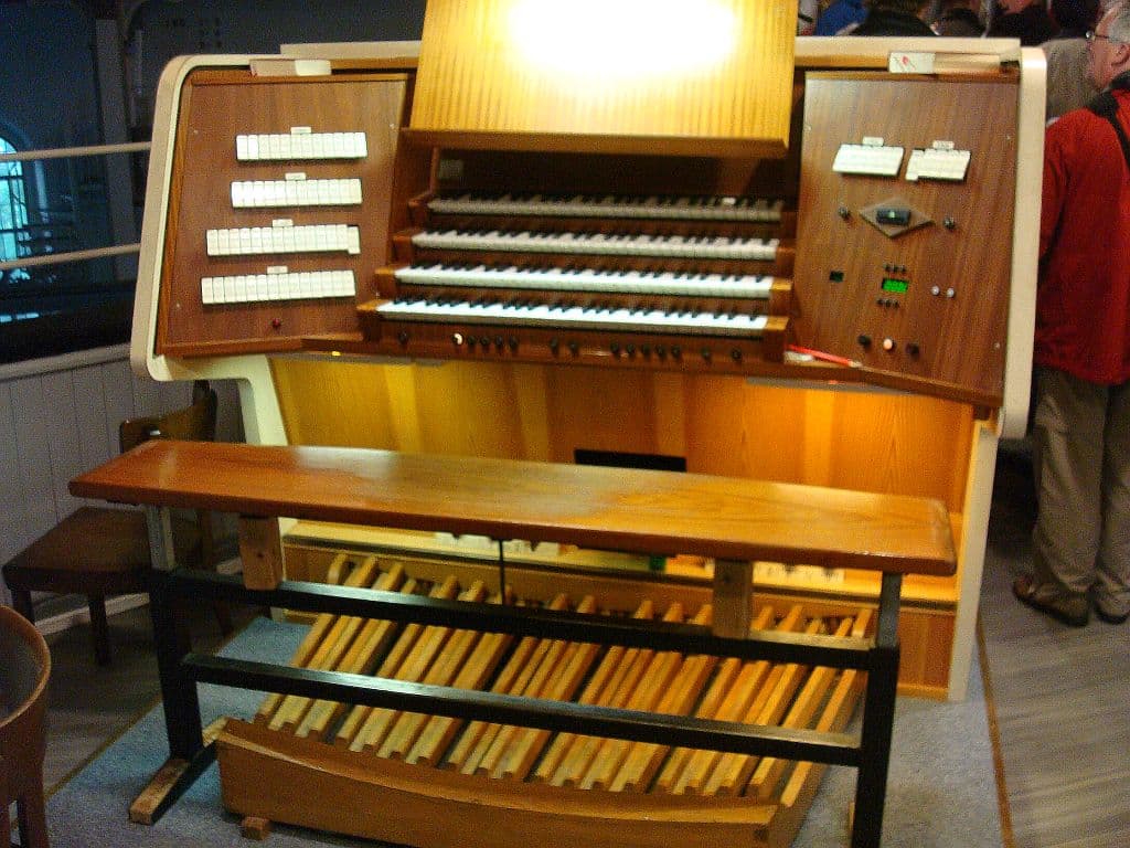 2. Manual: Lieblich Gedackt 16′ Rohrflöte 8′ Prinizipal 4′ Nachthorn 4′ Superoktave 2′ Scheizerpfeife 2′ Quinte 1 1/3′ Rauschpfeife 2fach Scharf 3fach Rankett 16′ |