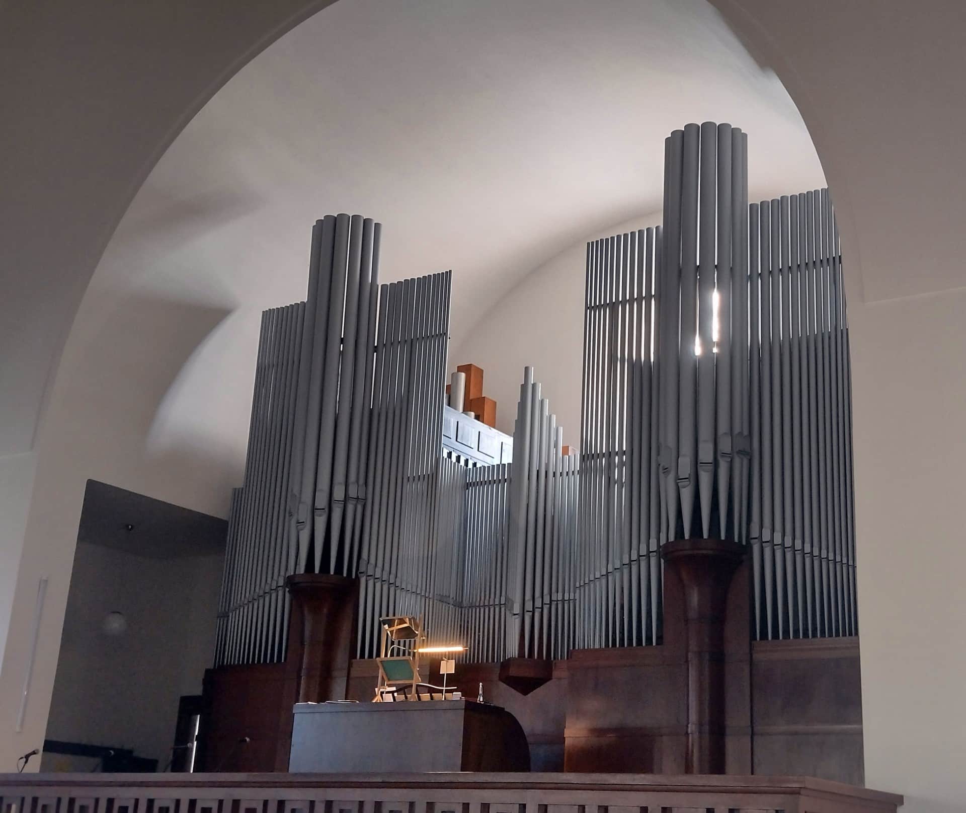 Schwellwerk rechts (III): C – g3 (56 toetsen) Geigenprincipal 8‘; Flûte harmonique 8‘; Lieblich Gedackt 8‘; Aeoline 8‘; Vox coelestis 8‘; Praestant 4‘; Fugara 4‘; Quintflöte 2⅔’; Bachflöte 2‘; Terz 1 3/5‘; Nachthorn 1‘; Dulcian 16‘; Oboe 8‘; Klarinette 8‘ (durchschl.).