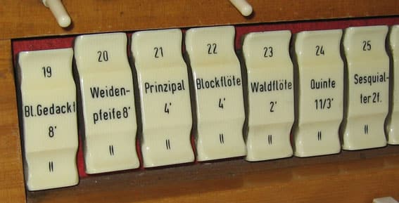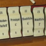 2. Manual: (C-g3) Bl. Gedackt 8 Weidenpfeife 8 Prinzipal 4 Blockflöte 4 Waldflöte 2 Quinte 1 1/3 Scharff 4f 2/3′ Sesquialtera 2f Cromorne 8 Tremolo |