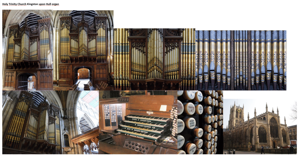 In 1845 bouwde Forster & Andrews in feite een nieuw drieklaviers orgel met materiaal van het vorige orgel van Hull Minster dat teruggaat op een instrument uit 1711 en dat in 1788 door Ryley uit York werd uitgebreid. De frontpijpen zijn gedecoreerd. In 1854 en 1876 werd het door dezelfde firma uitgebreid en omgebouwd. In 1900 breidde Forster & Andrews het uit met een vierde manuaal. In 1908 verplaatste Forster & Andrews het orgel en breidde het verder uit. In 1938 werkte John Compton Organ Co aan het orgel. Tegenwoordig verkeert het sleepladen-orgel met elektrische tractuur in slechte staat. Het pedaalklavier is radiaal concaaf. De toonhoogte is a’ = 446 Hz. De grootste bekers van de tongwerken zijn gekropt.