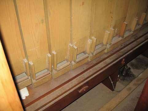 Pedaal: (C-f1) Praestant 16 Subbas 16 Praestant 8 (in front) Gedekt 8 unit Octaaf 4 unit Fagot 16 Basson 8 unit |