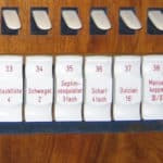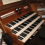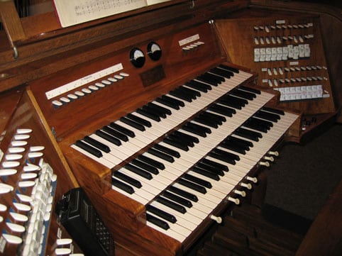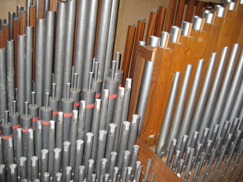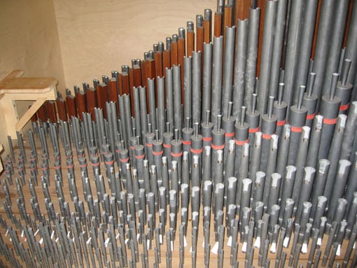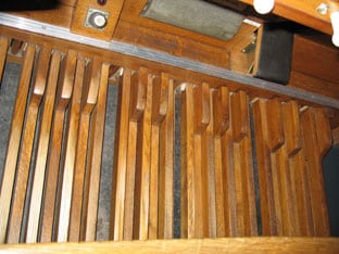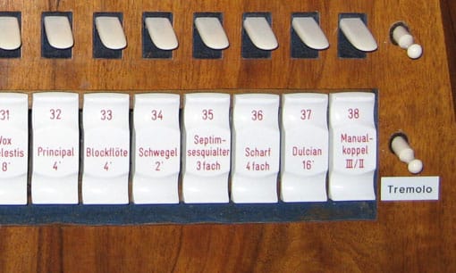 Schwellwerk: (C-g3) Rohrflöte 8 Salicional 8 Vox Coelestis 8 Principal 4 Blockflöte 4 Schwegel 2 Scharf 4f Septim-sesquialter 3f Dulcian 16 Tremolo |