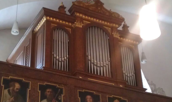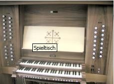| Hauptwerk: Bourdon 16 Principal 8 Gedackt 8 Salicional 8 Octav 4 Flöte 4 Octav 2 Quinte 1 1/3 (Auszug Mixtur) Mixtur Vf 1 1/3 Trompete 8  |