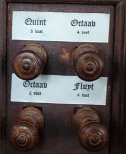 MANUAAL (CDEFGA – c3) 45 TOETSEN: Praestant 8′, Holpijp 8′, Octaaf 4′, Fluit 4′, Quint 3′, Super Octaaf 2′, Sexquialter II sterk (discant) – 1975.