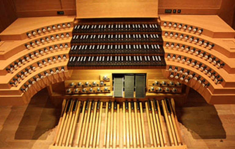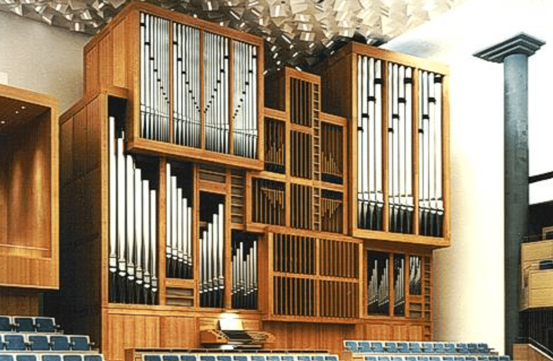 GRAND-CHOEUR (I) (C-c4): 61 TOETSEN Flûte Harmonique 8′, Grand Cornet 5 rangs, Bombarde 16′, Trompette 8′, Clairon 4′, Sho 8′ – Japans tongwerk.