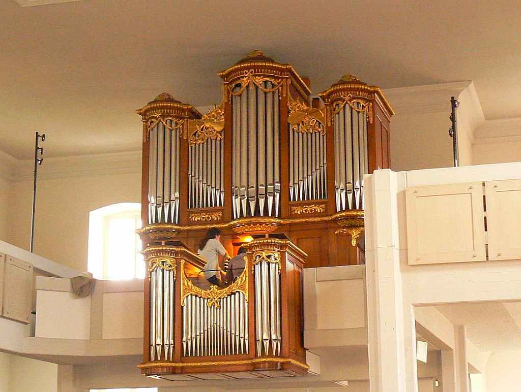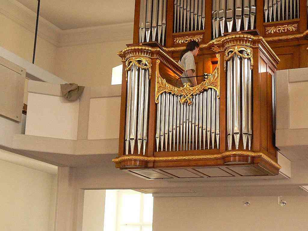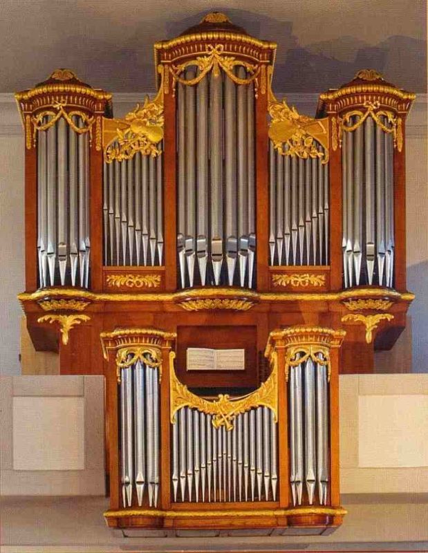 HAUPTWERK: C – d3 (51 TOETSEN) Bourdon 16′ – 1786/1975, Principal 8′ – 1786/1975, Salicional 8′ – 1786/1975, Couppel 8′, Piffara 8′ (vanaf f°) – 1818, Gamba 8′ – 1786/1975, Praestant 4′ – 1786/1975, Rohrflöt 4′, Quint 3′, Octav 2′, Cornet 5 fach (vanaf a), Mixtur 4 fach (1 1/3′), Trompet 8′ (gedeeld), Vox Humana 8′ – 1975, Clairon 4′ – 1975.