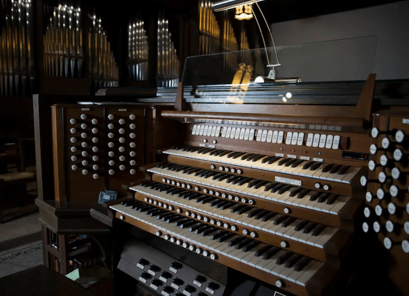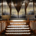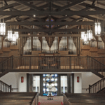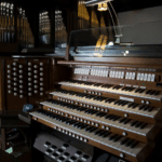 CHOIR (C – c4) 61 TOETSEN: Violone 16′, Violone 8′ – extension, Voce Umana 8′ (TC), Holzgedeckt 8′, Silver Flute 8′, Flute Celeste 8′ (TC), Octave 4′, Koppelflöte 4′, Super Octave 2′, Larigot 1 1/3′, Full Mixture 4 ranks, Krummhorn 8′, Tremulant, Tuba Major 8′ – high pressure, Trompette en Chamade 8′ – prepared, from Great.
