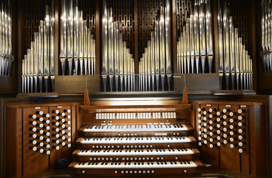 GREAT (C – c4) 61 TOETSEN: Violone 16′ – from Choir, Open Diapason 8′, Violine 8′ – from Choir, Bourdon 8′, Harmonic Flute 8′ (TC), Principal 4′, Spire Flute 4′, Twelfth 2 2/3′, Fifteenth 2′, Seventeenth 1 3/5′, Chorus Mixture 4 ranks, Trumpet 8′, Tuba Major 8′ – from Choir, Trompette en Chamade 8′ – prepared, Tremulant, Chimes (25 tubes), Cymbelstern.