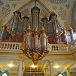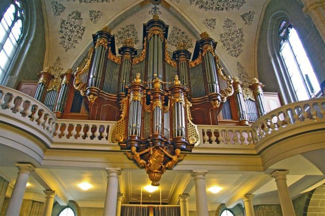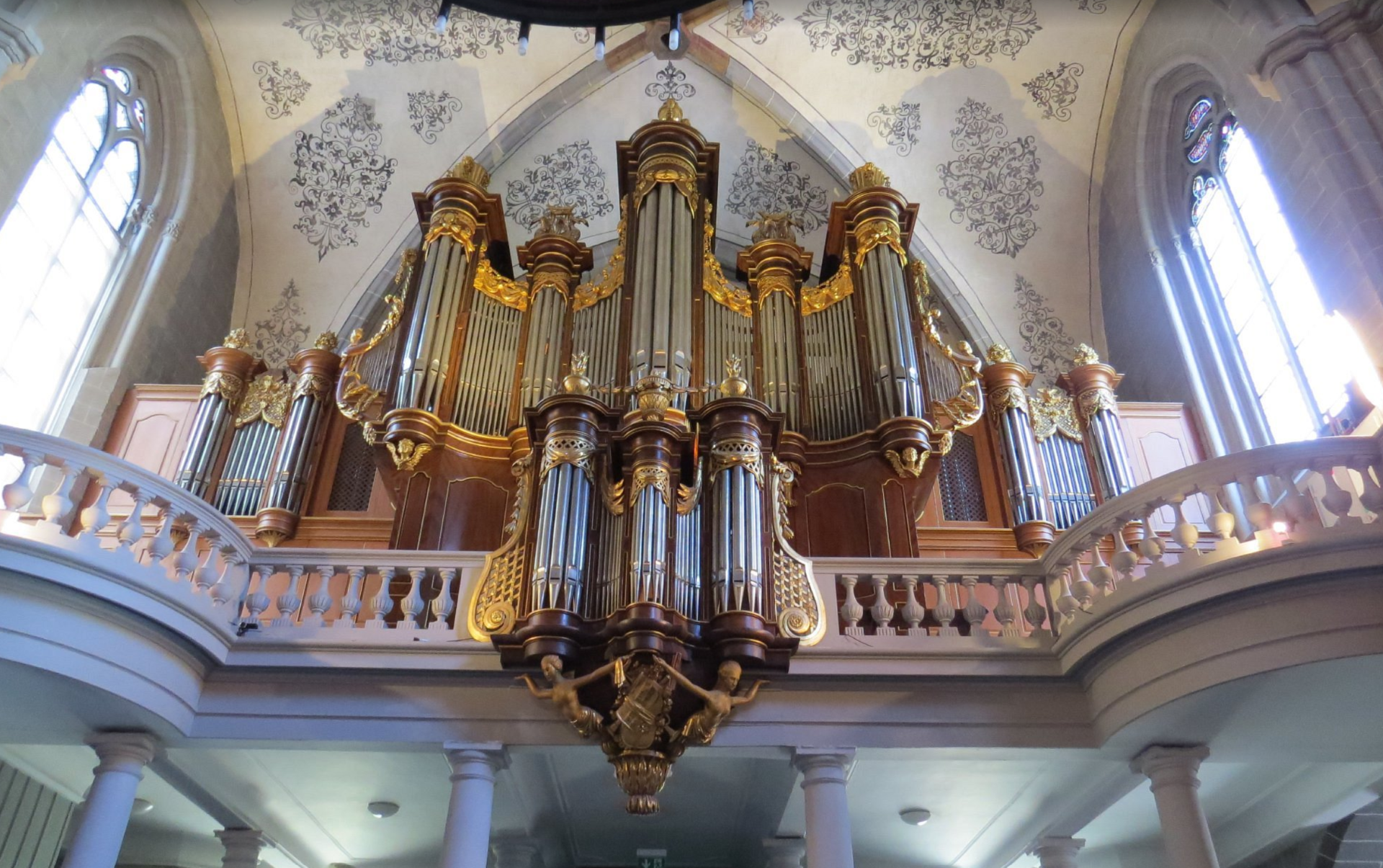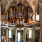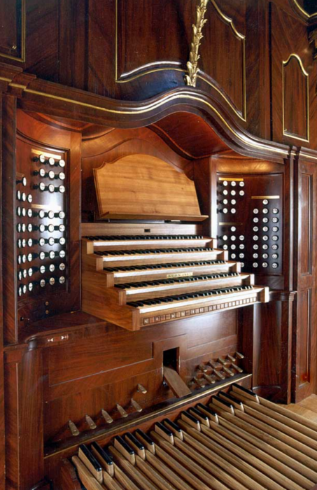 GRAND ORGUE (C – c4) 61 TOETSEN: Dessus de Flûte 32′ (discant), Principal 16′, Bourdon 16′, Montre 8′, Bourdon 8′, Gambe 8′, Nazard 5 1/3′, Prestant 4′, Tierce 3 1/5′, Quinte 2 2/3′, Doublette 2′, Fourniture 4 rangs (2 2/3′), Cymbale 3 rangs (1 1/3′).