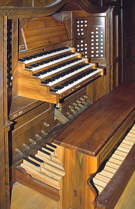 SOLO (C – c4) 61 TOETSEN: Principal 8′, Bourdon 8′, Salicional 8′, Prestant 4′, Flûte 4′, Doublette 2′, Cornet 3 rangs (2 2/3′), Sordun 16′, Clarinette 8′, Tremblant.