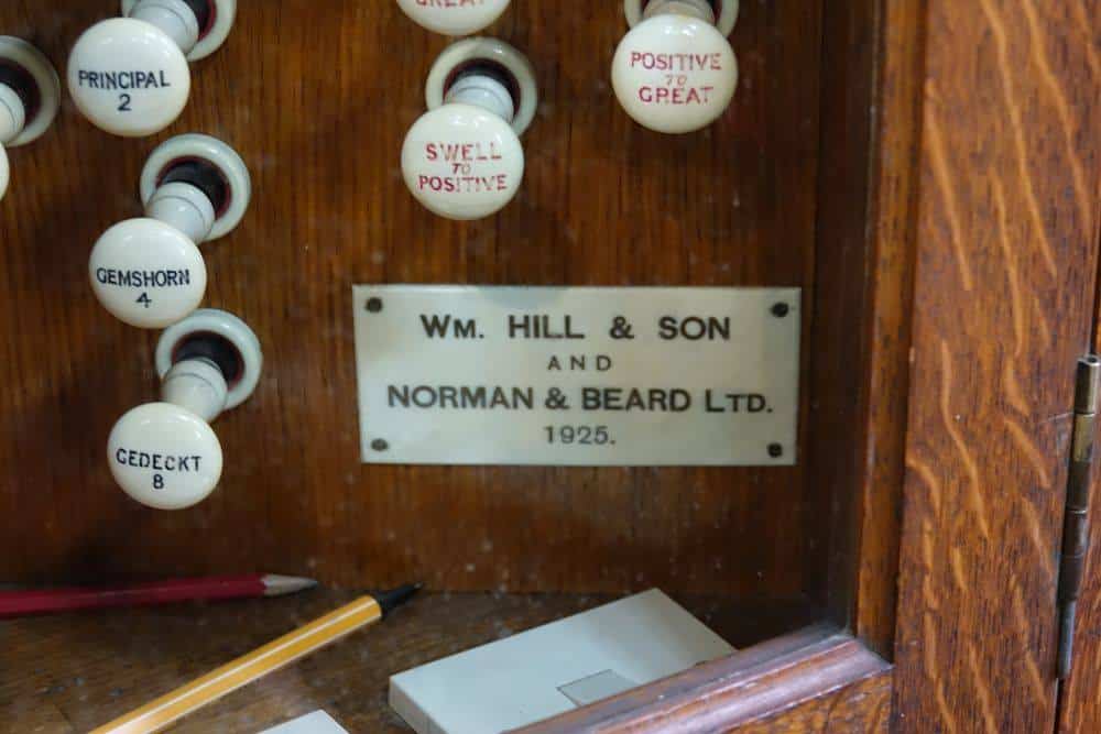 Swell Organ: C – c4 (61 toetsen) Bourdon 16′, Open Diapason 8′, Hohl Flute 8′, Echo Gamba 8′, Celeste 8′ (TC), Lieblich Flute 4′, Octave Gamba 4′, Fifteenth 2′, Mixture 3 ranks, Contra Fagotto 16′, Cornopean 8′, Oboe 8′, Clarinet 8′, Clarion 4′, Tremulant.