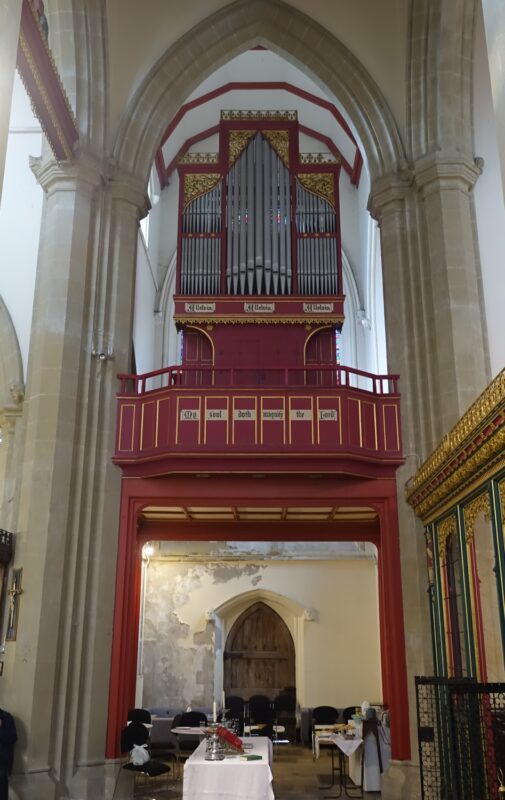 GREAT (C – a3) 58 TOETSEN: Open Diapason 8′, Wald Flute 8′, Dulciana 8′, Harmonic Flute 4′.