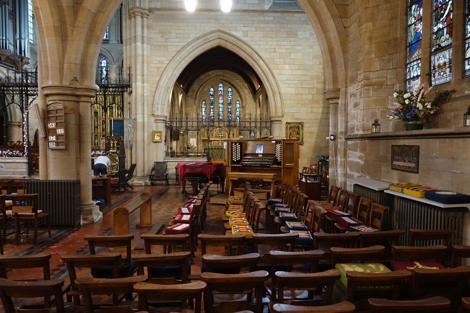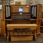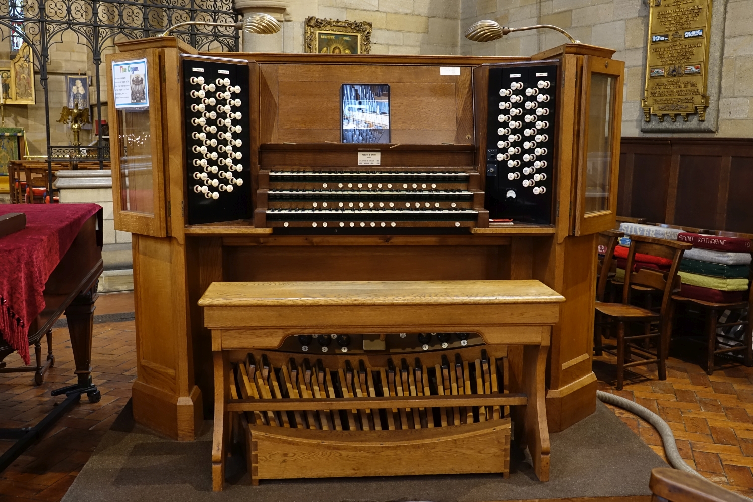 CHOIR (C – c4) 61 TOETSEN: Open Diapason 8′, Gedeckt 8′, Dulciana 8′, Gemshorn 4′, Lieblich Flute 4′, Nazard 2 2/3′, Piccolo 2′, Tierce 1 3/5′, Orchestral Oboe 8′, Clarinet 8′, Tremulant, Posaune 8′ (Great), Clarion 4′ (Great).