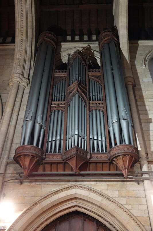 GREAT (C – c4) 61 TOETSEN: Double Open Diapason 16′, Open Diapason I 8′, Open Diapason II 8′, Hohl Flute 8′, Viola 8′, Octave 4′, Principal 4′, Harmonic Flute 4′, Twelfth 2 2/3′, Fifteenth 2′, Mixture IV (15.22.26.29), Trumpet 8′, Posaune 8′, Clarion 4′.