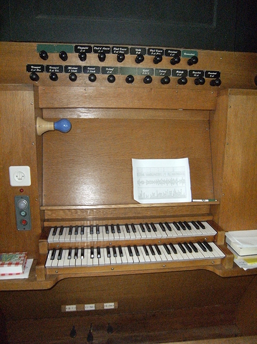 Bovenwerk: C – f3 Fluit Douce 8′ (gedeeld), Viola di Gamba 8′ (vanaf c), Prestant 4′, Fluit d’Amoer 4′, Flageolet 2′ – 1960.