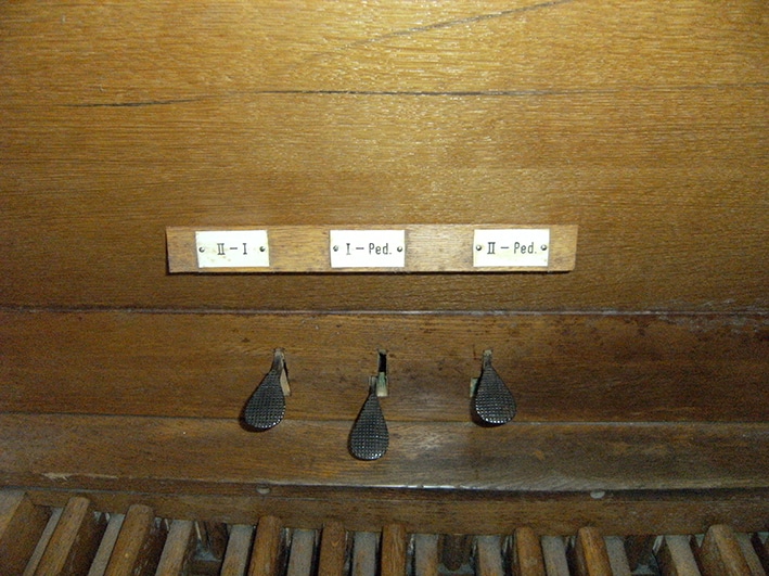 Koppelingen: Manuaalkoppel, Pedaal – Hoofdwerk, Pedaal – Bovenwerk.