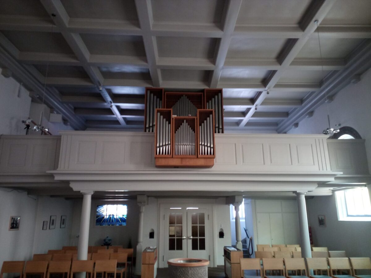 HAUPTWERK (C-g3): 56 TOETSEN Gedackt 8′, Blockflöte 4′, Prinzipal 2′, Quinte 1 1/3′, Sesquialtera 2 fach (1 1/3′), Scharf 3 fach.
