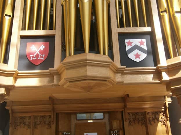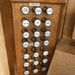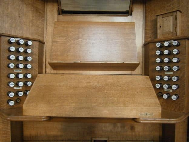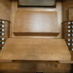 PEDAL (C – f1) 30 TOETSEN: Double Open Wood 32′ – C-H 2016, Open Diapason 16′ – 1892, Violone 16′ – 1892, Bourdon 16′ – 1892, Octave 8′ – 1892, Bass Flute 8′ – 1892, Trombone 16′.