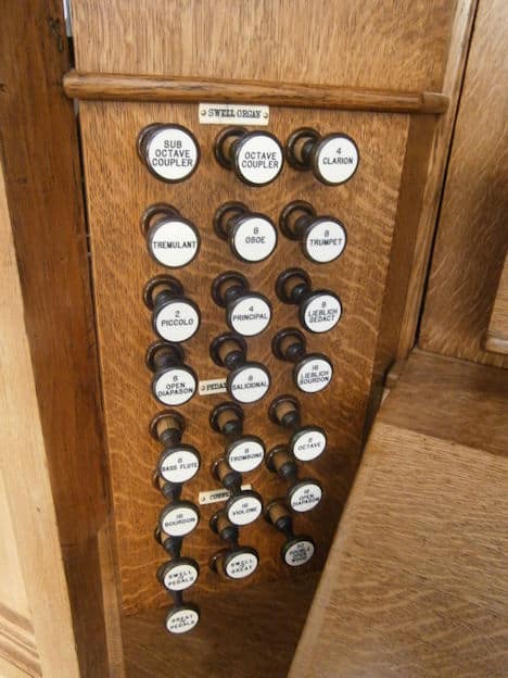 SWELL (C – g3) 56 TOETSEN: Lieblich Bourdon 16′ – 1892, Open Diapason 8′ – 1892, Lieblich Gedact 8′ – 1892, Salcional 8′ – 1892, Vox Angelica 8′ – gereserveerd, Principal 4′ – 1892, Piccolo 2′ – 1892, Mixture 3 ranks – gereserveerd, Contra Fagotto 16′ – gereserveerd, Oboe 8′ – 1892, Trumpet 8′ – 1892, Clarion 4′ – 1892.