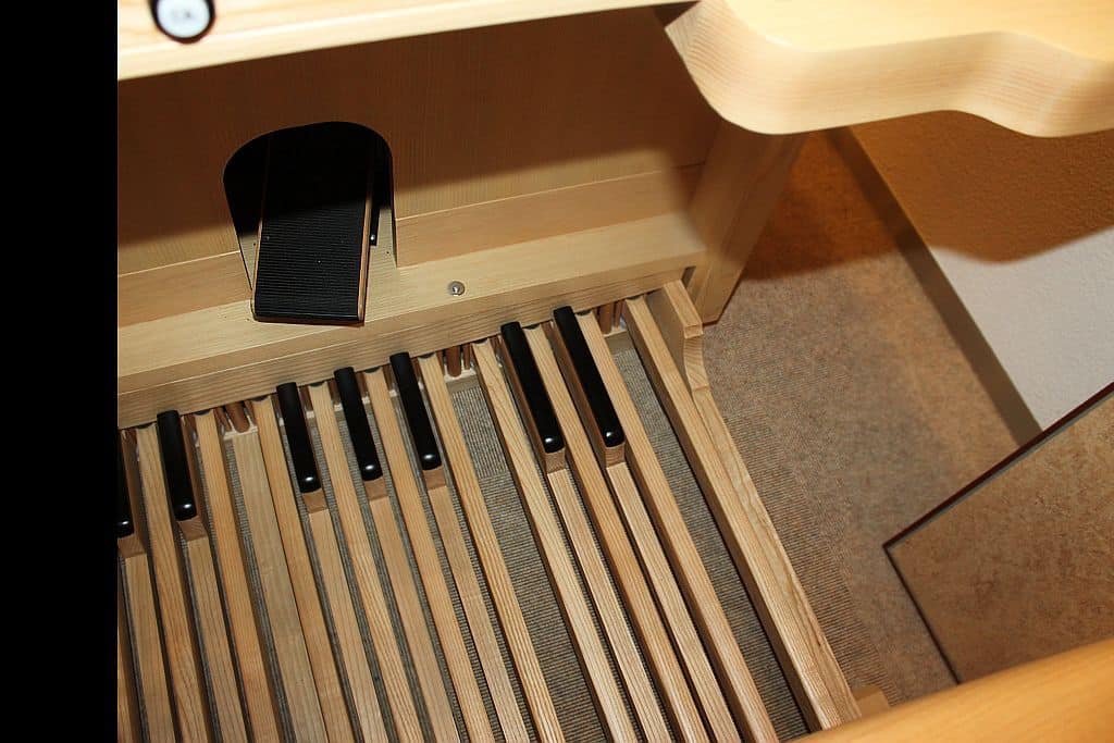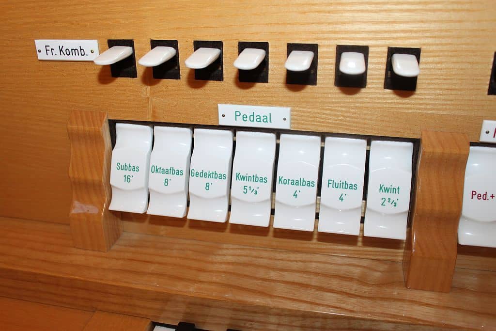 Pedaal: C – f1 Subbas 16′, Oktaafbas 8′, Gedektbas 8′, Kwintbas 5 1/3′, Koraalbas 4′, Fluitbas 4′, Kwint 2 2/3′.