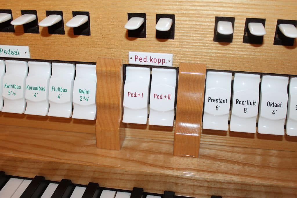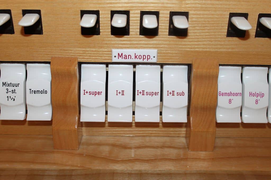 Koppelingen: Manuaal I – Manuaal II, Manuaal I – Manuaal II Super, Manuaal I – Manuaal II Sub, Pedaal – Manuaal I, Pedaal – Manuaal II, Manuaal I Super.